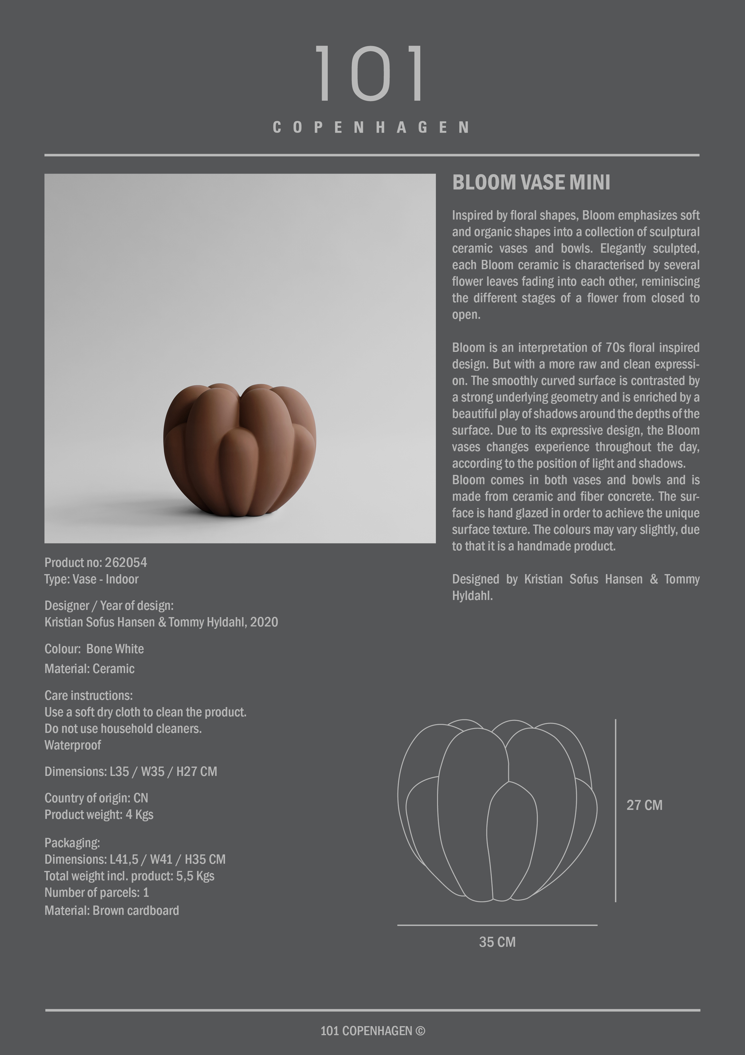 Geïnspireerd door de organische vormen van bloemen, ontvouwt de Bloom-collectie zich tot een serie sculpturale vazen en schalen met zachte, vloeiende lijnen. Elk object is ontworpen met lagen bloemblaadjes die in elkaar overlopen, waardoor een gevoel van beweging ontstaat van gesloten knop tot volle bloei. De collectie is geïnspireerd op de bloemendesigns uit de jaren 70, maar met een rauwere en ingetogener uitstraling, waarbij het gladde oppervlak contrasteert met een heldere, onderliggende geometrie. Het licht speelt met de diepte van de vorm, waardoor Bloom een levendige uitstraling krijgt die van karakter verandert met het wisselende licht en de schaduwen van de dag.