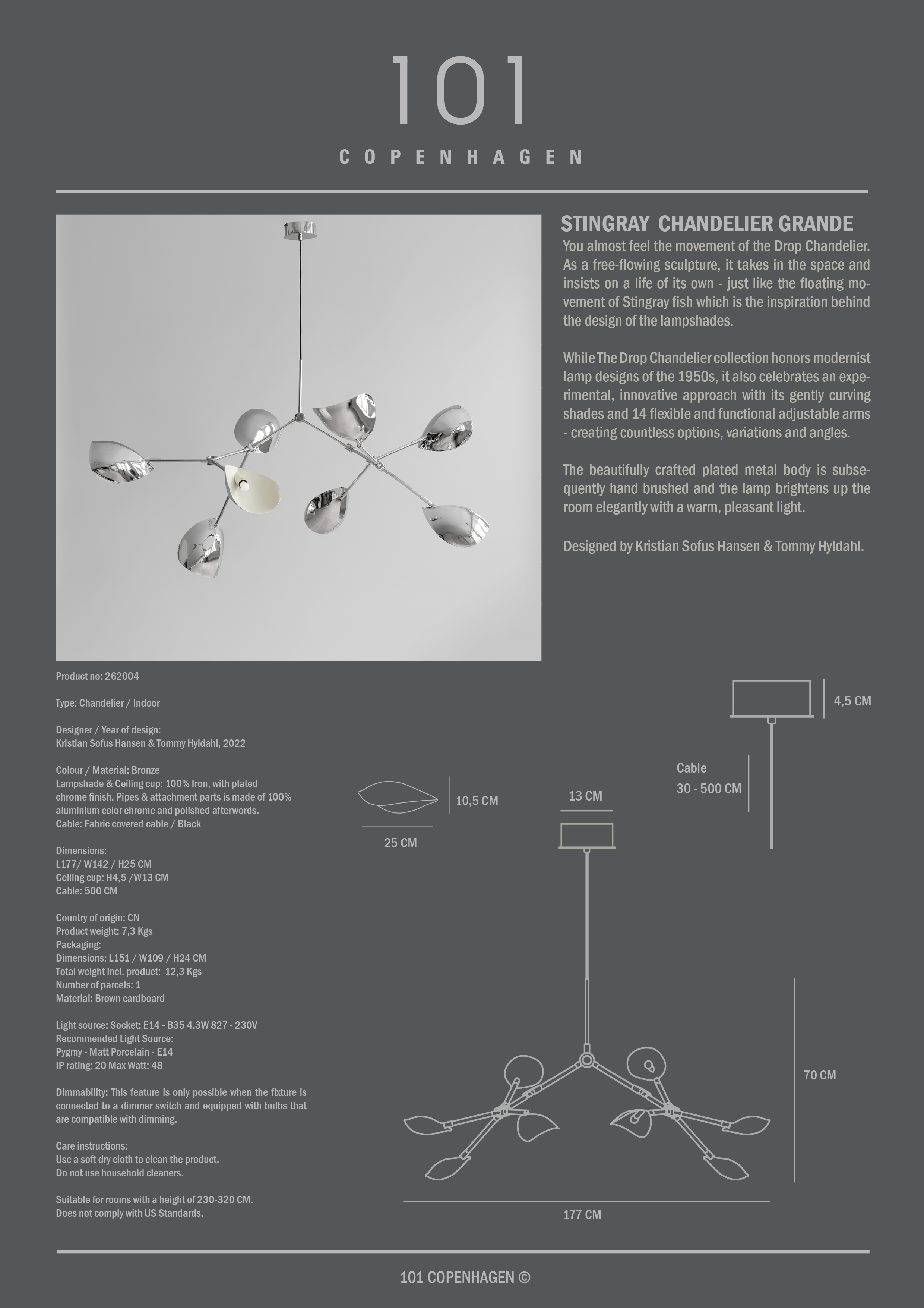 Geïnspireerd door de sierlijke bewegingen van de rog, is de Stingray Light Series een harmonieuze samensmelting van zachte rondingen en opvallende lijnen. De zwevende elegantie van de Stingray lampenkap staat centraal, waarbij de sculpturale vorm een dynamisch samenspel van licht en schaduw creëert. Naarmate het perspectief verandert, verbergt en onthult de lampenkap subtiel de lichtbron, wat een betoverende en steeds veranderende lichtbeleving oplevert. Dit verfijnde ontwerp komt tot uiting in een adembenemende kroonluchter, evenals een elegante tafel- en vloerlamp. De laatste onderscheidt zich door zijn driepotige structuur, verankerd aan een halfronde lampenvoet die ritmische balans en moeiteloze eenvoud aan de compositie geeft. De Stingray lampenkap, opgehangen aan een verstelbare arm, zweeft in perfect evenwicht, gecontrasteerd door een delicate bol, een artistieke expressie van contrast en gewichtloosheid.