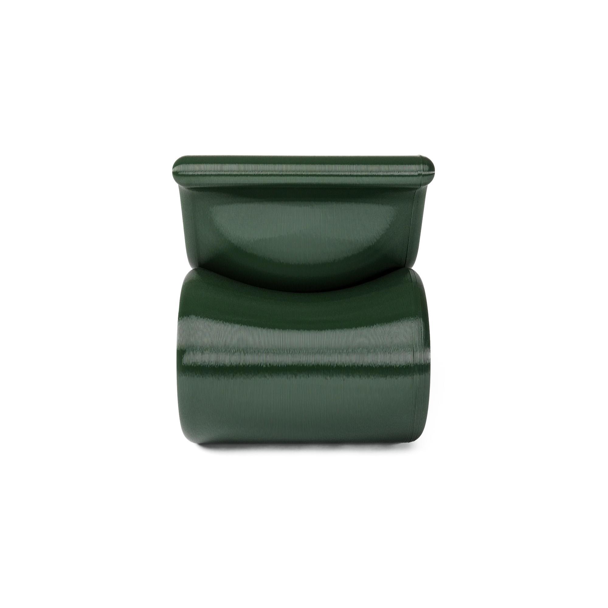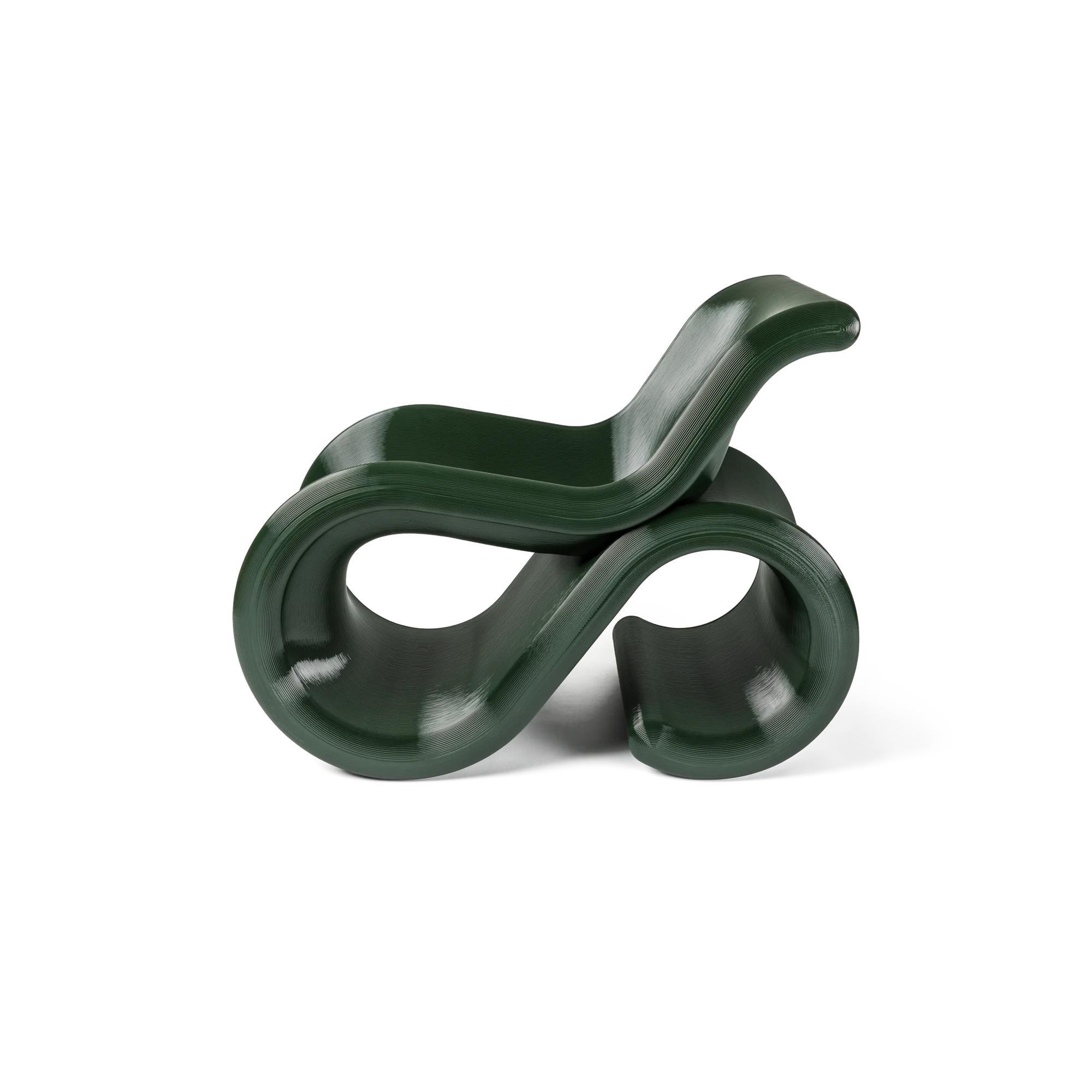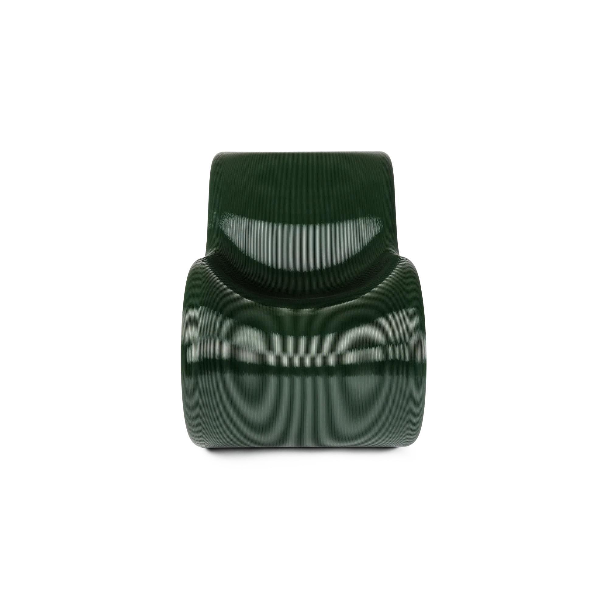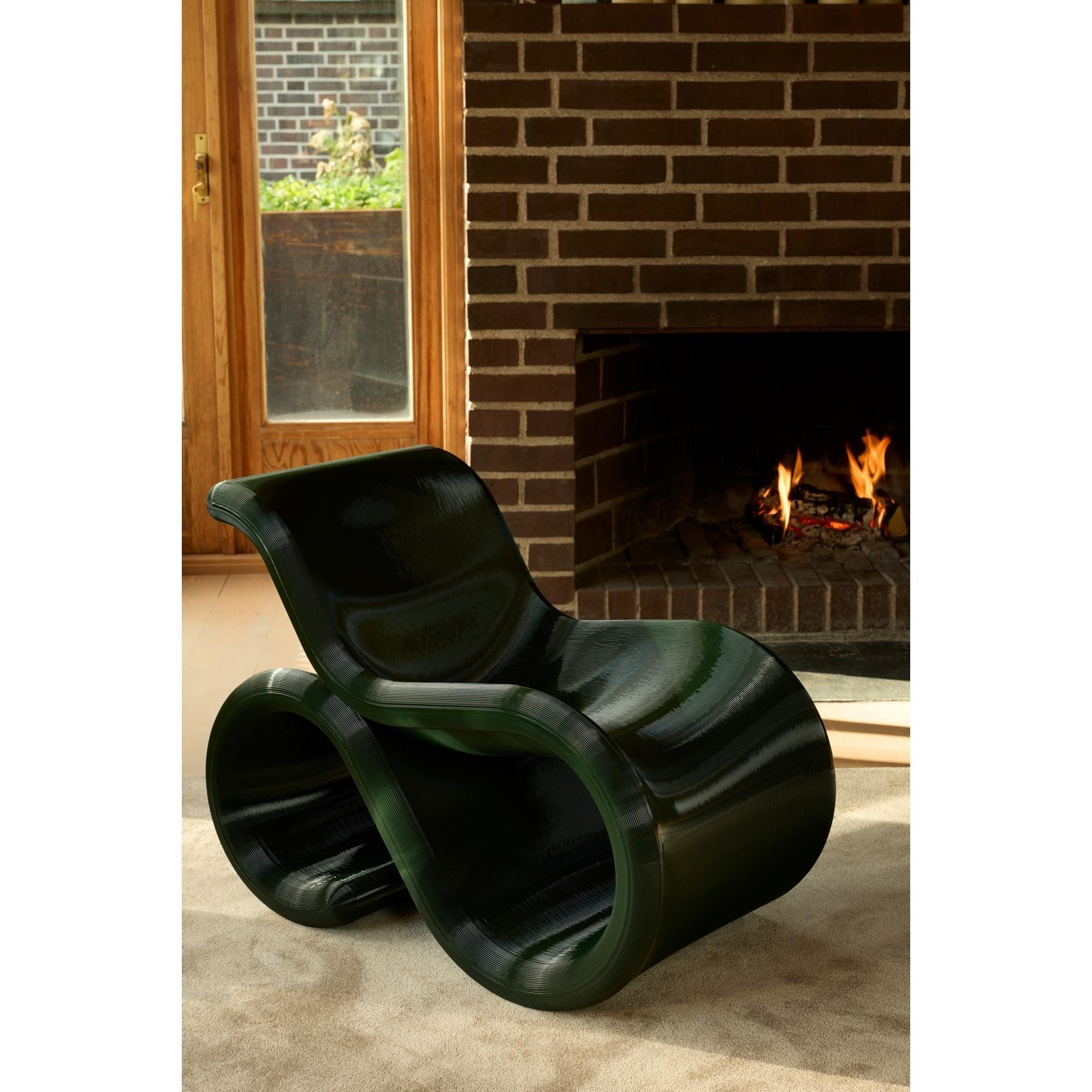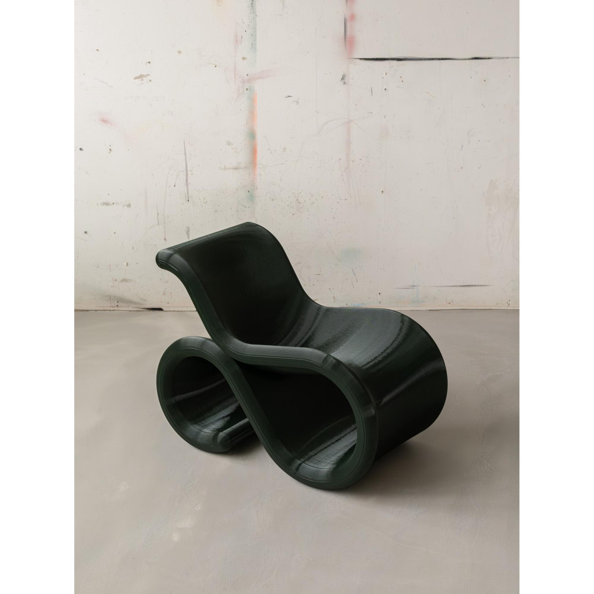 Éclair is een sculpturale fauteuil waarin vorm, functie en materiaalkennis samensmelten tot één harmonieus uitstraling. De stoel kenmerkt zich door zachte, vloeiende lijnen en een opvallend silhouet dat een bijna zwevende indruk geeft en tegelijkertijd uitnodigt tot ontspanning. De fauteuil is gemaakt van rPETG, een gerecycled kunststof dat sterkte, flexibiliteit en een licht doorzichtig diepte combineert, waardoor de gelaagde structuur en het tactiele oppervlak van de stoel extra opvallen. De organische vorm volgt de natuurlijke lijnen van het lichaam en zorgt voor een comfortabele zitervaring zonder bekleding; het comfort ontstaat door de constructie zelf.