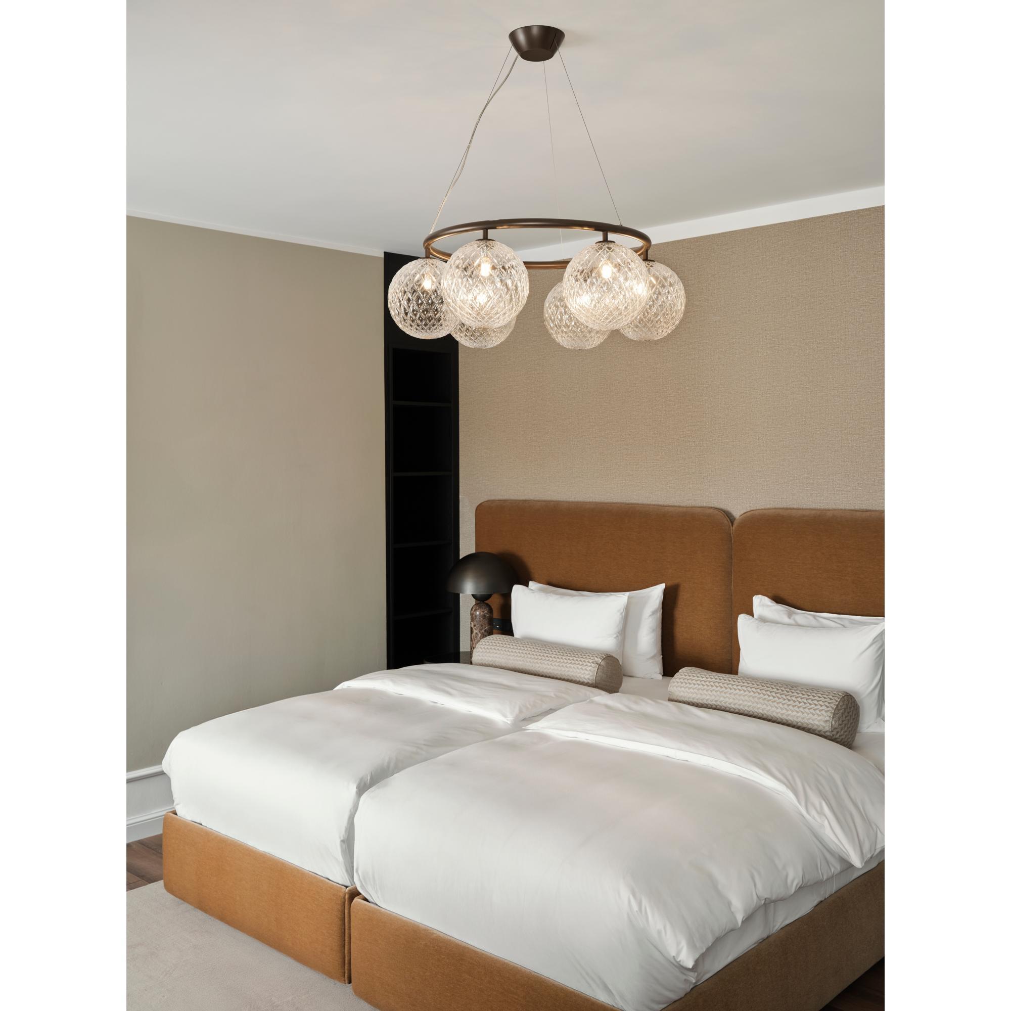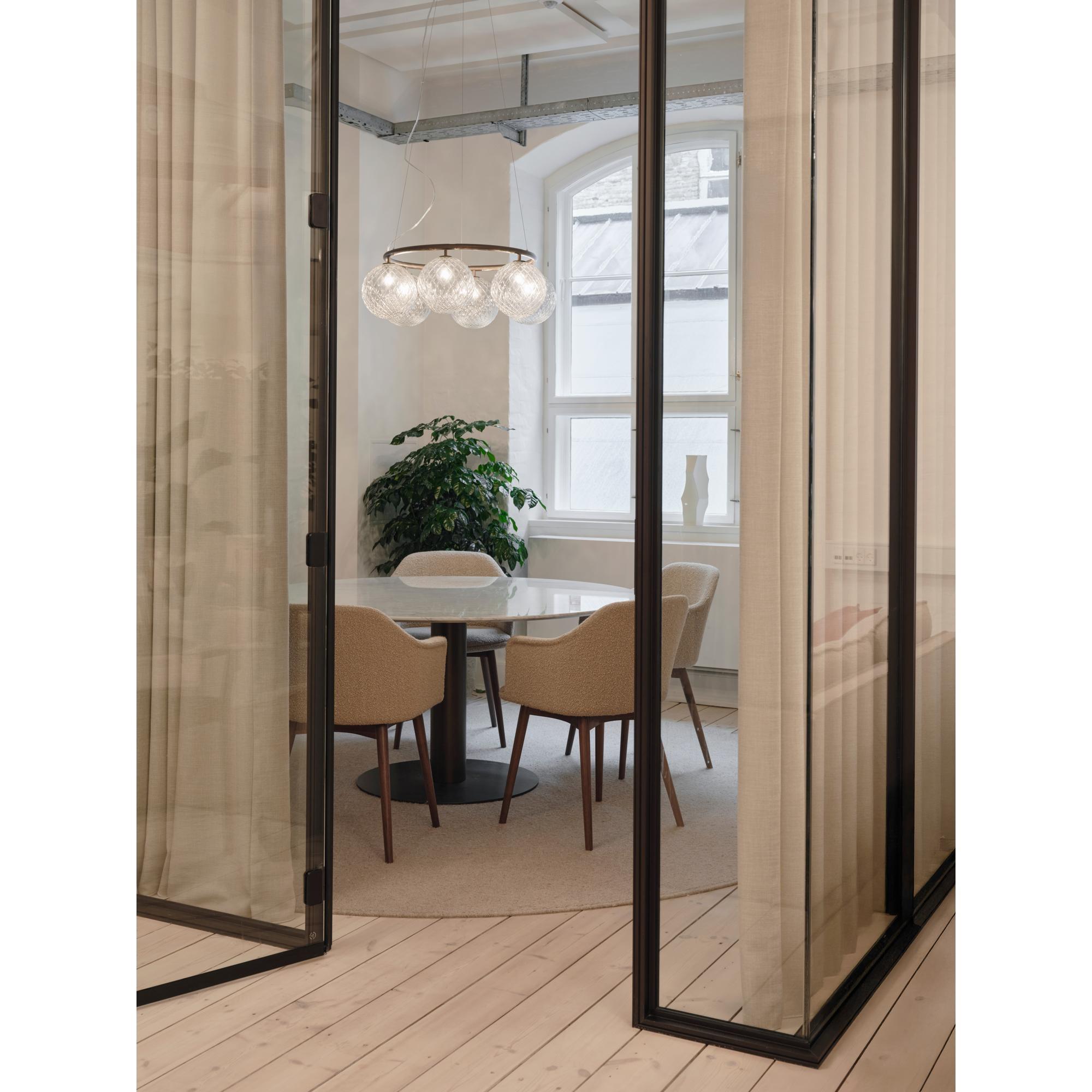 Nuura Miira 6 Cicurlar is een ongelooflijk mooie kroonluchter met veel aandacht voor details. De delicate ronde vormen geven de kroonluchter een buitengewoon sierlijke uitstraling. De Miira-collectie omvat lampen van mondgeblazen glas, in zowel optisch als opaal wit. Omdat het glas met de hand wordt vervaardigd, kunnen er kleine variaties in het patroon van de optische bollen voorkomen. Elke glazen bol is daarom volkomen uniek. De Miira-collectie is ontworpen met de kroonluchter als middelpunt, omringd door de andere lampen uit de serie, zoals Miira 1, Miira 3, Miira 4 of een van de andere prachtige Miira-lampen uit de collectie. Miira 6 is verkrijgbaar in een groter formaat met 8 glazen bollen en is ook verkrijgbaar met opaal- of optische glazen bollen. let op: voor deze lamp is een LED-lamp vereist.